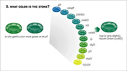 The sample stone is thereby graded very slightly bluish green (vslbG), medium tone (5), vivid saturation (6). |